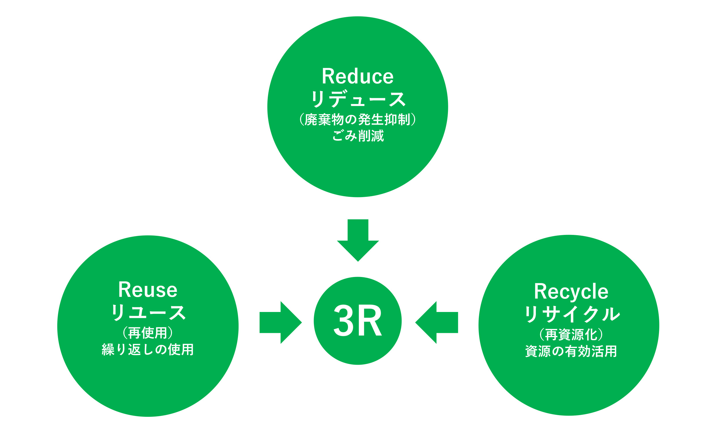 3Rとは、Reduce:リデュース(廃棄物の発生抑制)、Reuse:リユース(再使用)、Recycle:リサイクル(再資源化)という3つの単語の頭文字をとったもので、「ごみ削減」「繰り返しの使用」「資源の有効活用」といった環境と経済が両立する循環型社会を形成していくための3つの取り組みです。 (出典:リデュース・リユース・リサイクル推進協議会ウェブサイト、経済産業省「3R政策ホーム」ウェブサイト)