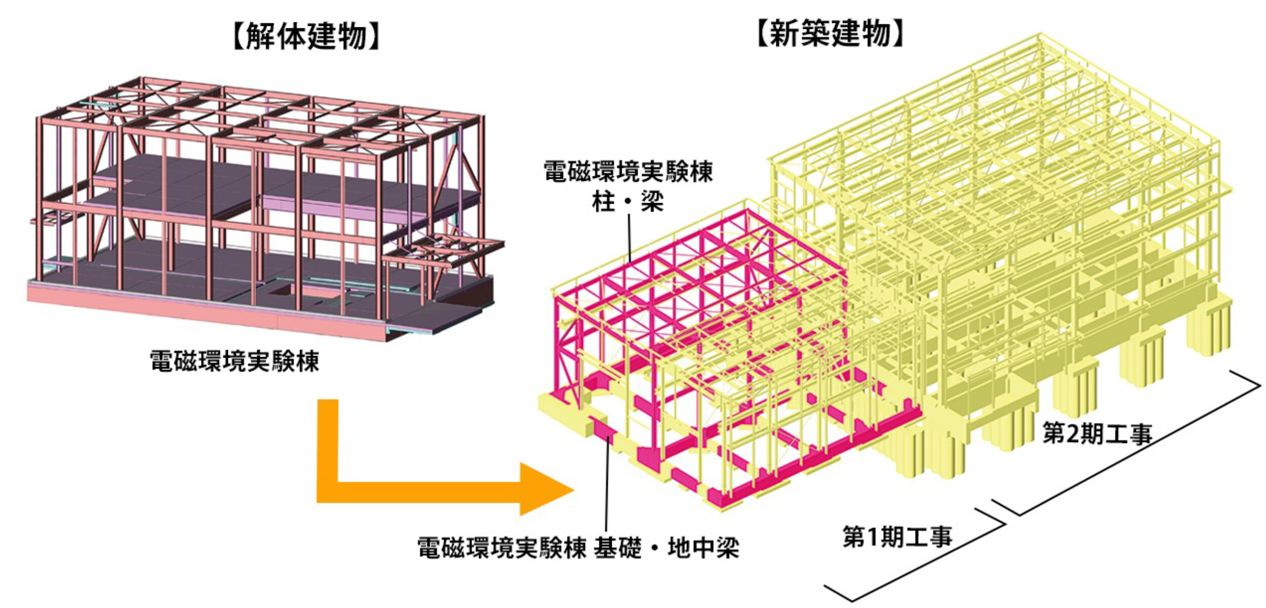 解体する実験棟の柱・梁・ブレースなどの鉄骨部材を取り出し、新築建物に合わせて切断などの加工を行ったうえで、再び構造体として使用します。