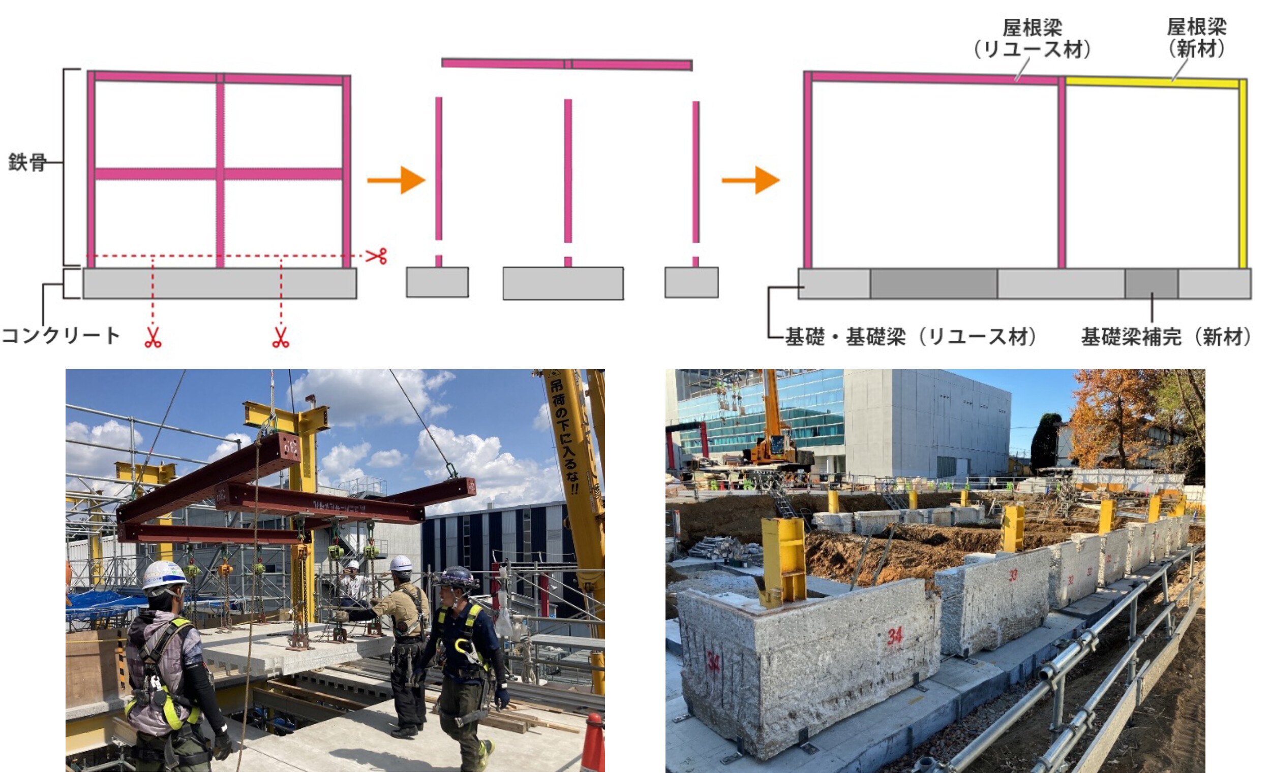 さらに、基礎・基礎梁・床などのコンクリート構造部材についても、新築建物の平面形状に合わせて切断後、接合部を加工し、現場で新材と接合するなど、新たな建物の構造体としてリユースします。この方法によって、スパンの変更も可能になるため、より自由度が高い、構造部材の有効活用が実現します。