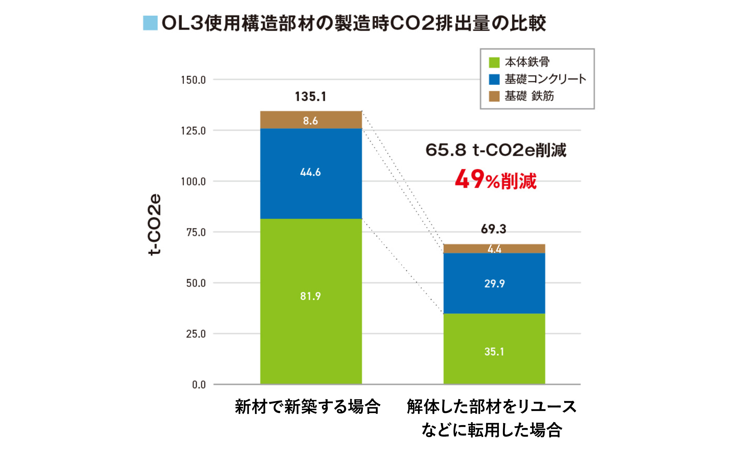 リユース材を活用することで、新材を使用した場合に比べ、部材製造時におけるCO2排出量を抑えることができます。