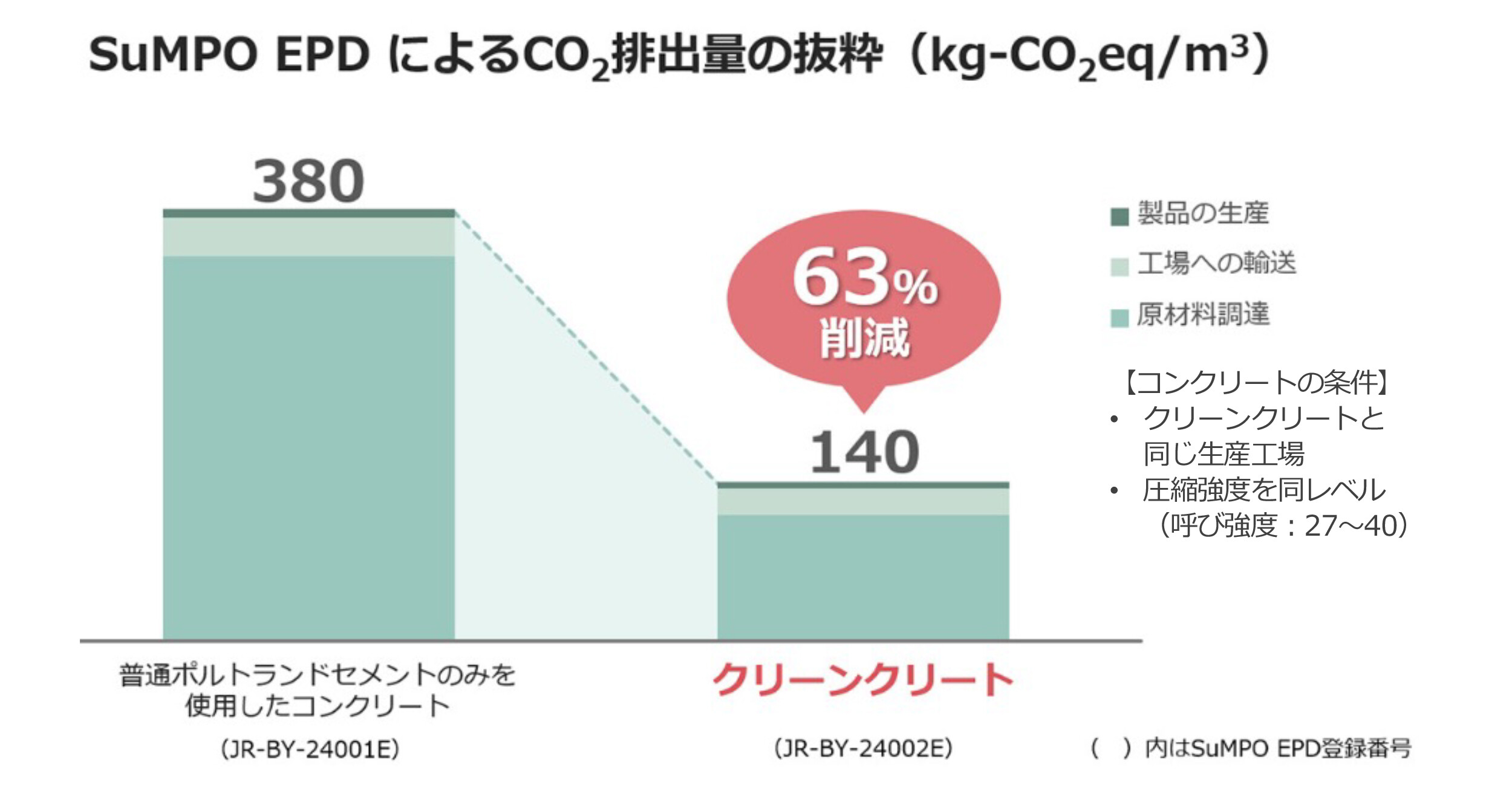 神代:「2024年の6月にサステナブル経営推進機構『SuMPO(さんぽ)』の製品環境認証制度である『SuMPO EPD(※2)』(旧エコリーフ)を取得しました。一般的なコンクリートが1m³当たり380kgのCO2を排出するのに対して『クリーンクリート®』は1m³当たり140kgと算定され、約63%のCO2を削減することが公的機関によって示されたのです」