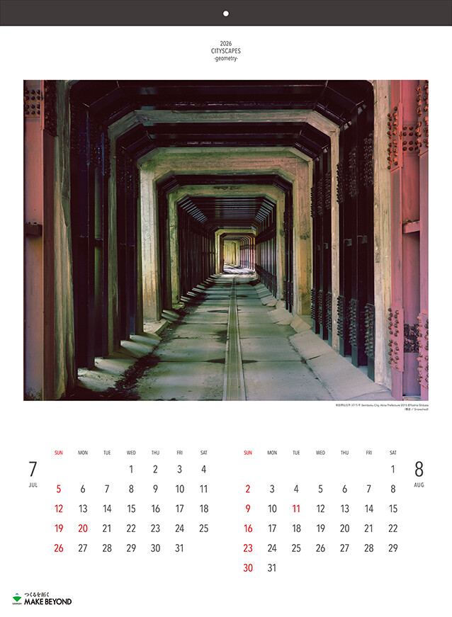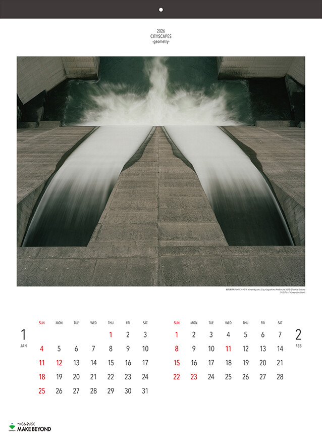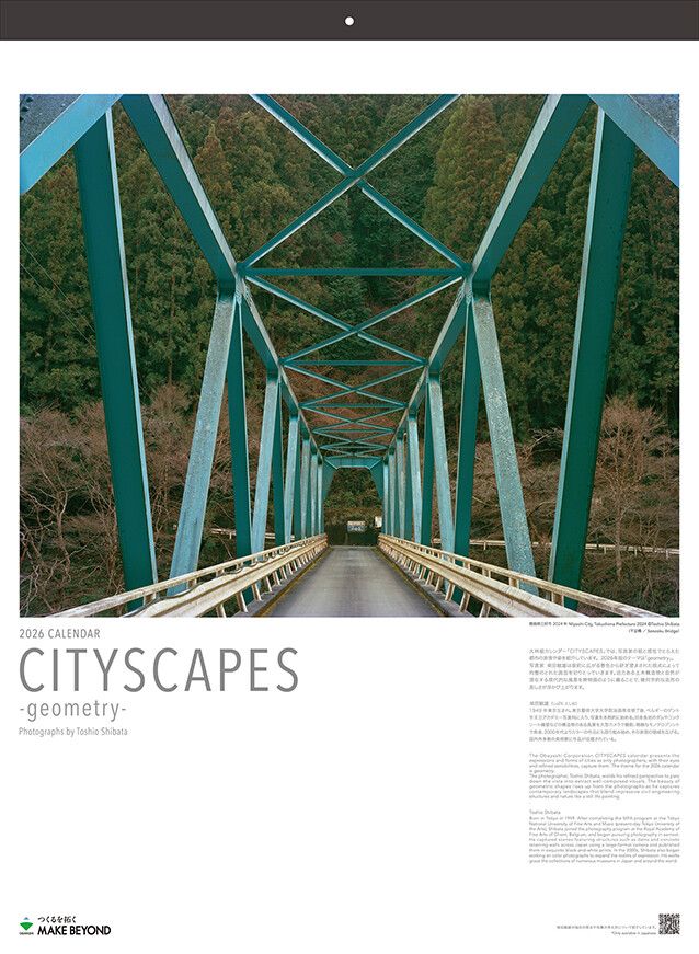2022年版から展開している「CITYSCAPES」シリーズでは、写真家の眼と感性でとらえた都市の表情や姿を紹介しています。2026年版のテーマは「geometry(幾何学)」。写真家 柴田敏雄さんは、都市のインフラストラクチャーである土木構造物と自然が混在する現代的な風景から、研ぎ澄まされた視点によって均整のとれた画面を切りとっています。眼前に広がる景色を静物画のように撮ることで、幾何学的な造形の美しさが浮かび上がります。