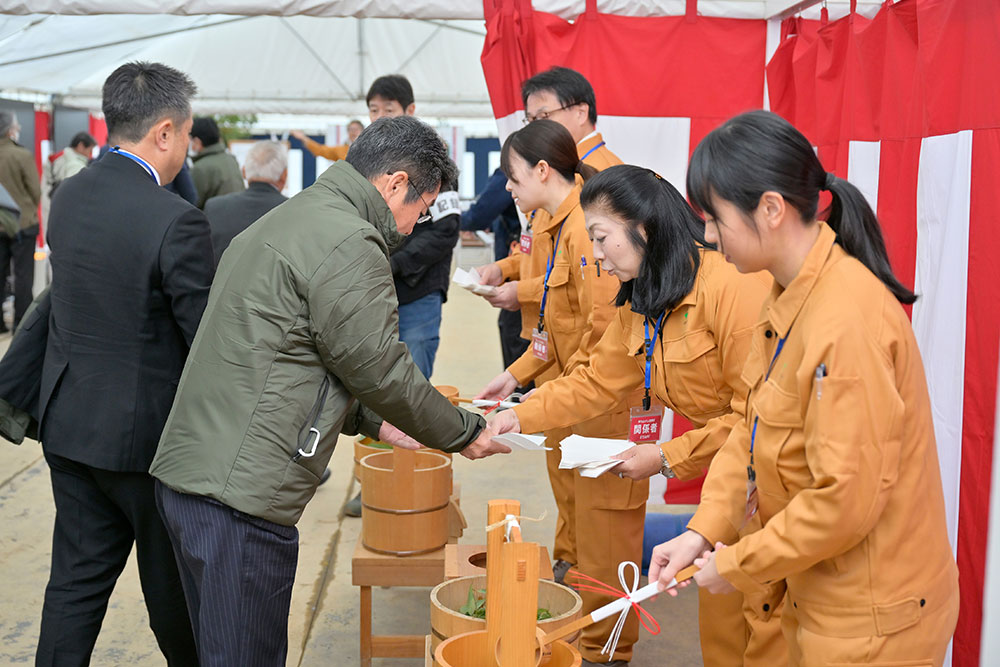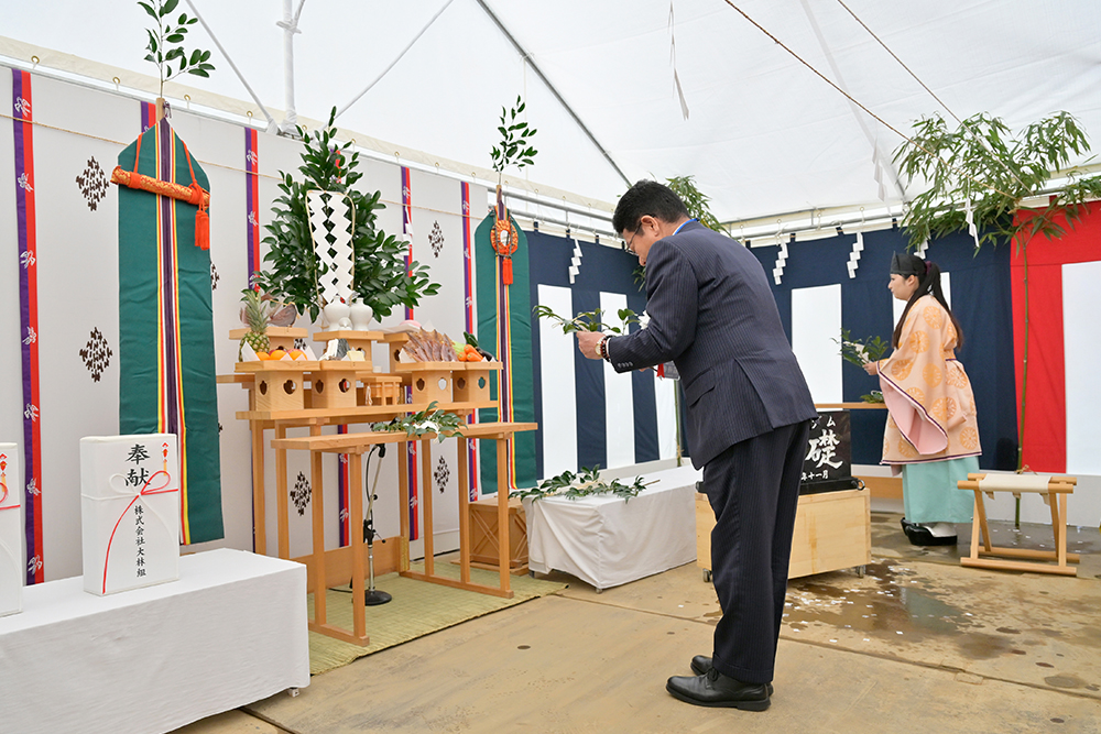 定礎式に先立って開催された安全祈願祭(大林組JV主催)では、大舩神社 永田宮司による礎石のおはらい、大林組常務執行役員 名古屋支店長の秋山隆之をはじめ工事関係者による玉串奉てんを行いました。