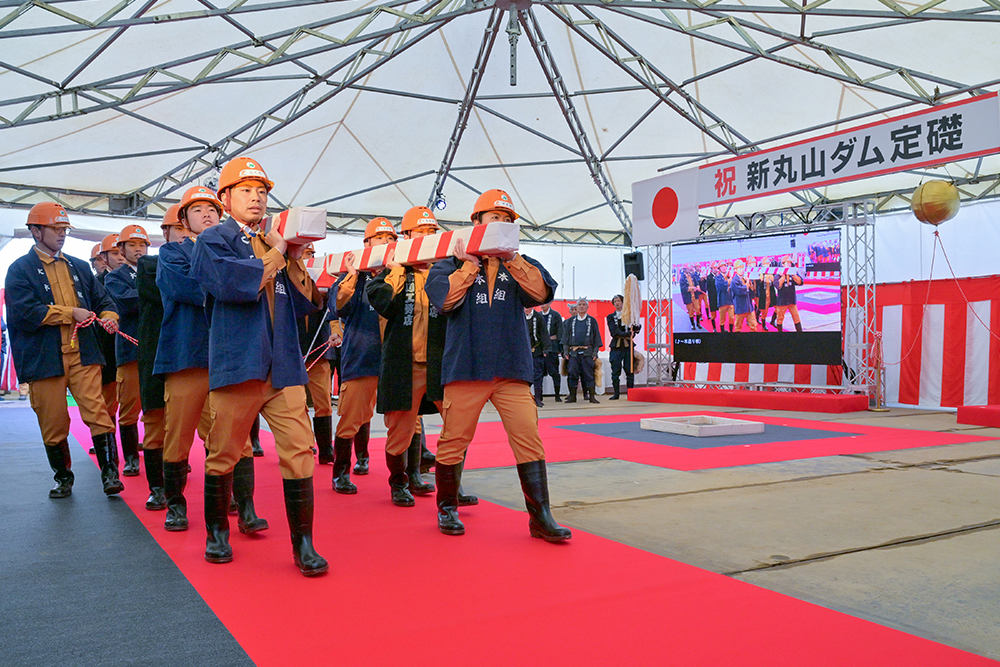 国土交通省主催の定礎式には、約200人の来賓が参列。国土交通省事務次官の式辞、来賓からの祝辞に続き、中津川市の付知町木曳音頭保存会の皆様による木遣り(きやり)が披露される中、新丸山ダム工事事務所および大林組JV職員によって礎石が搬入されました。定礎式では、鎮定(ちんてい)の儀、斎鏝(いみごて)の儀、斎槌(いみつち)の儀に続いて、埋納(まいのう)の儀を挙行。さらに、八百津町と御嵩町の児童代表者が、それぞれの思いを込めたメッセージストーンを埋納しました。その後、ケーブルレーンの自律運転によりコンクリートが運搬、打設され、礎石を埋納。参列者全員による万歳三唱、くす玉開披により定礎式は滞りなく閉会しました。
