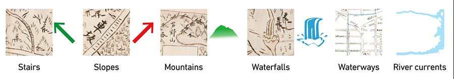 In order to create 3D renderings of the map, the project team set out to decipher the topography and validate the elevation differences on the map. The periphery of the map contains annotations for slopes and stairs used in old maps. In addition, multiple parallel lines indicating elevation differences were drawn between the north side of the imperial palace and the samurai residences, and detailed microtopographic features were also drawn in the town. The foothills of the mountains feature marks that appeared to represent waterfalls with a drop, indicating that the Hashihara castle town and its surrounding environment had a varied topography.
