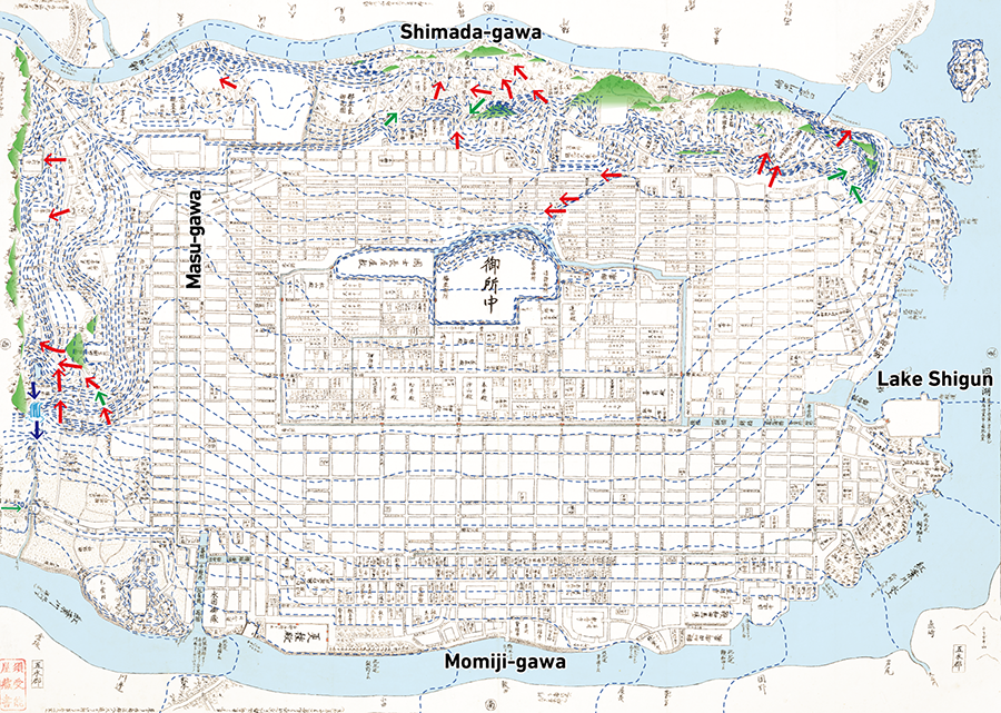 On the other hand, where rivers are concerned, it was common practice on old maps to write the names of rivers from upstream to downstream. Accordingly, Shimada-gawa on the north side flowed from west to east and into the lake. Momiji-gawa on the south side flowed from the lake in the east to the west. Furthermore, Masugawa-tori on the west side of the map showed Masu-gawa flowing from north to south. These observations suggest that the town center sloped from north to south and from east to west in a complex and discontinuous manner.