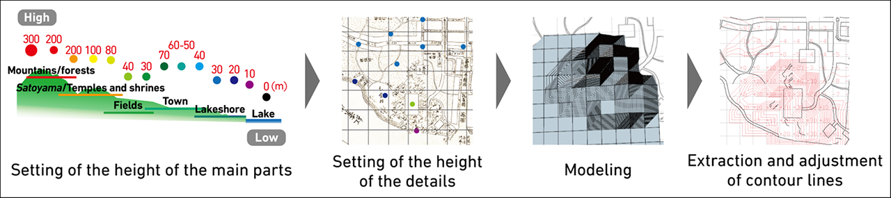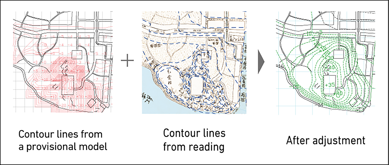 In addition, the project team conjectured that the entire Hashihara castle town had a slope of around 0.3% to 0.5% by comparing it with the riverbed gradient of Kamo-gawa in Kyoto and the topographic gradient of Matsusaka, which presumably would have influenced the young Norinaga. Using this information as a guide, the team then drew contour lines and carried out modeling by setting specific heights of key sites, before extracting contour lines from the model to elucidate the detailed topography of the town center.