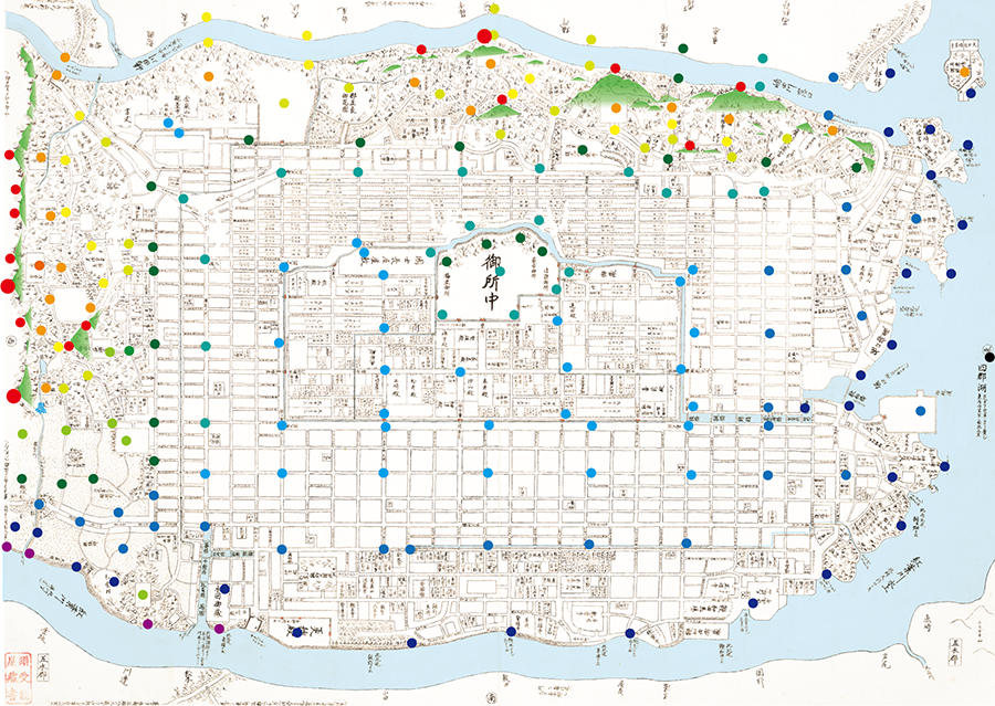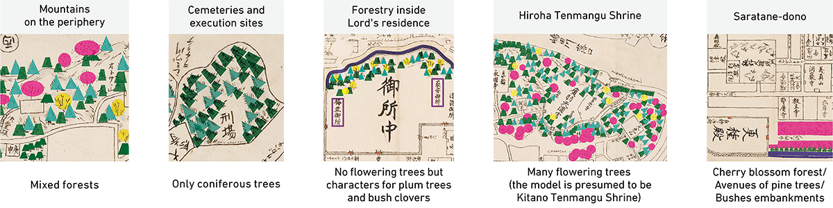 There were also some spots where pictures were annotated with words, such as "cherry blossom forest." To give further weight to these conjectures, the team conducted a comparative review using historical documents from the same period, such as Rakuchu Rakugai Zu and the Meisho Zue of the Edo period, to figure out the species of trees depicted on the map. The trees were also color-coded according to their species.