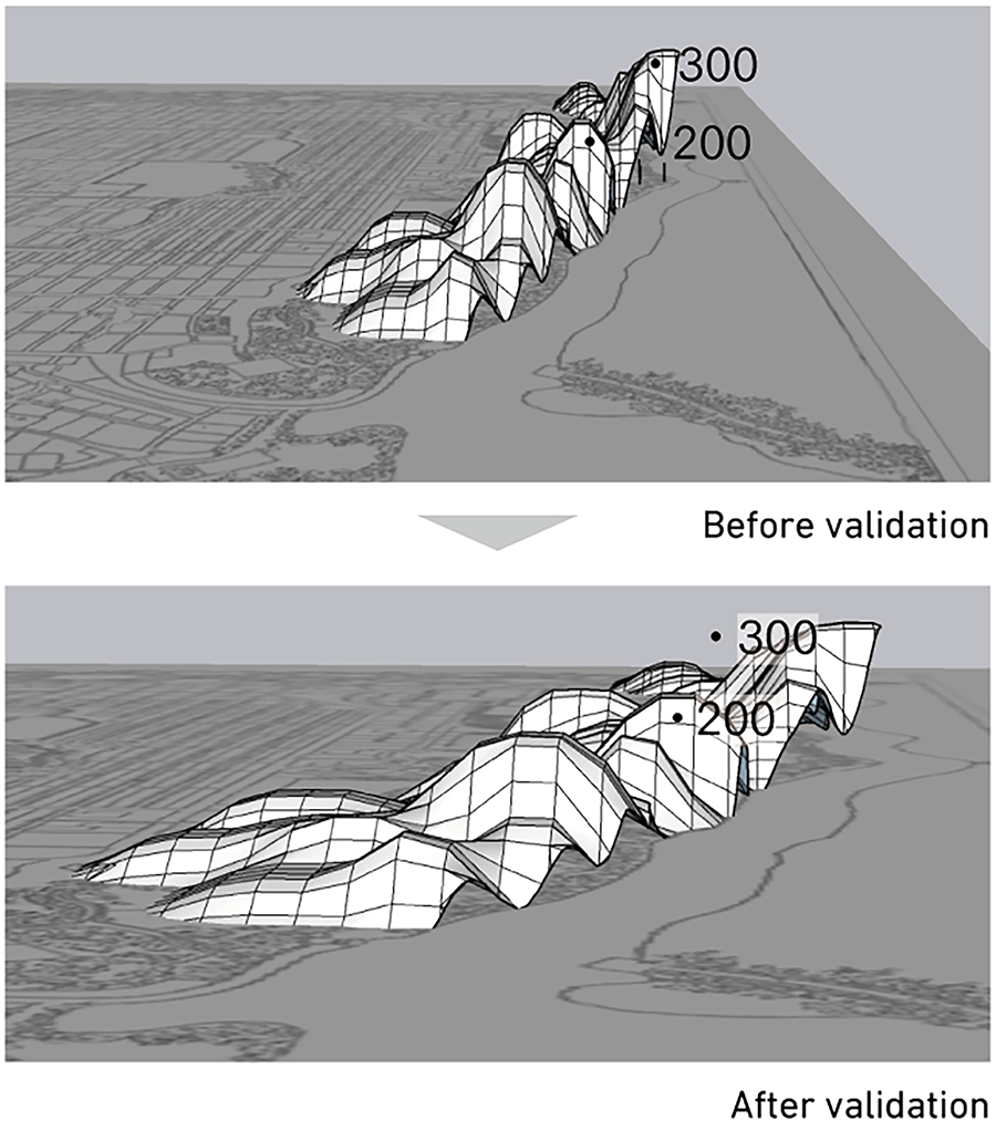 It was found that in old maps of Kyoto, even though the city center was drawn almost to scale, distances to the surrounding mountains and paths in the mountains were drawn with a ratio of one unit in the map's longitudinal direction for every half-unit in the latitudinal direction. If one were to attempt a three-dimensional rendering of the mountains based on the planar geometry of the old maps of Kyoto and the elevation of the mountains which would not have changed from the past to the present, the mountains would appear to be extremely steep. In creating 3D renderings of the Hashihara Castle Town Map, the height of the mountains was assumed to be around 200 to 300 meters by using the elevation of mountains in Kyoto as reference, and it was found that doubling the background distance of the mountains across the entire range in which they were drawn resulted in a natural shape for the mountains.