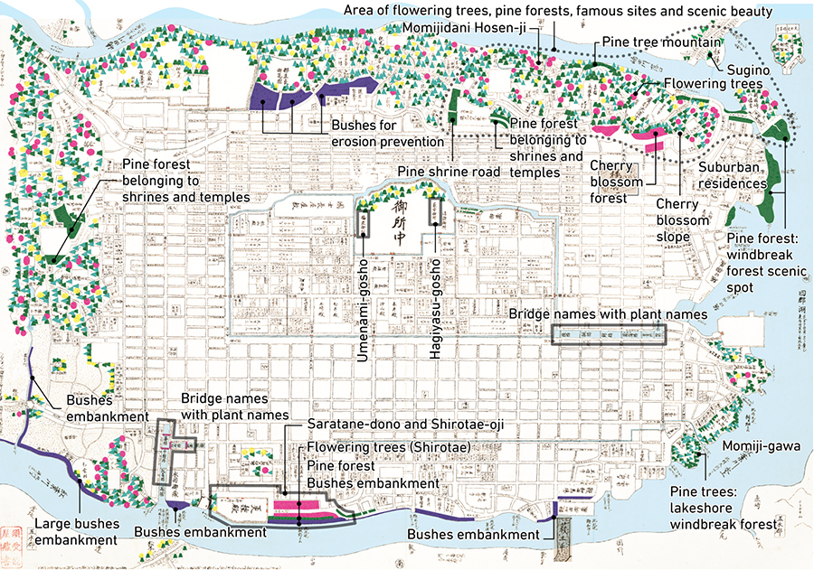 Several bridges in the castle town were named after plants as well, including katsura, maple, iris, white chrysanthemum, and kashiwa (emperor oak). In addition, annotations for the imperial palace included sites that contained the names of plants reminiscent of spring and autumn, such as Umenami-gosho and Hagiyasu-gosho.