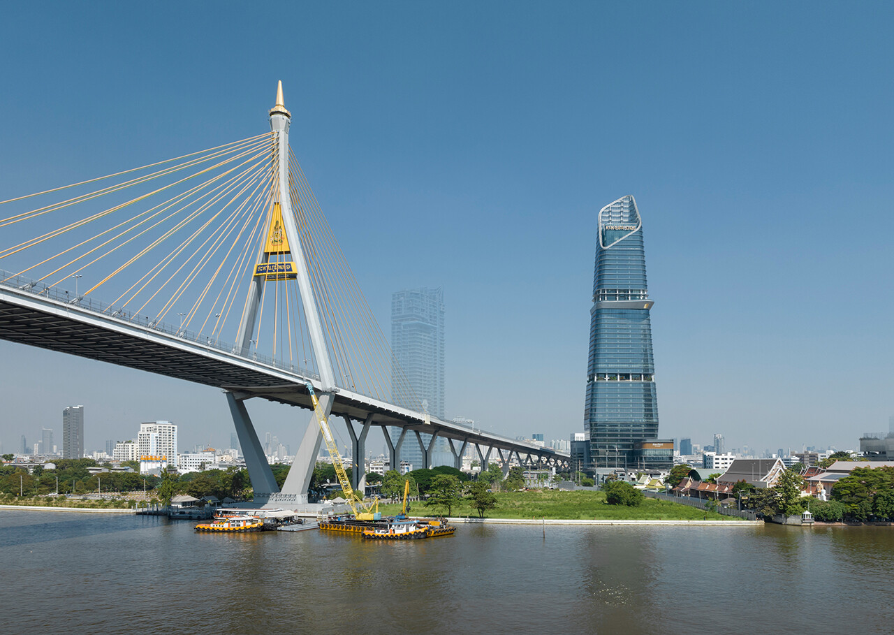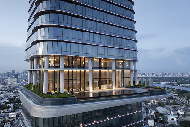 Developed by Thailand's leading corporate group, the Saha Group, this 255 m tall, 53-story high-rise office building stands along the Chao Phraya River. Its iconic exterior design, inspired by the silhouette of the Bhumibol Bridge's main tower, harmonizes with the surrounding area while establishing a landmark presence. The building has obtained international environmental certifications, including LEED and Fitwel (*1) 3-Star, balancing comfort with energy efficiency.