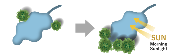 Originally developed as a large-scale farm, the site was a vast expanse of dry land with a water supply from the Satsunai River cut off by a levee. In the past, however, a river ran through it, and we had also learned that there was abundant subsoil water beneath the surface, fed by the river. Guided by the land's natural features and former river channels, we decided to revive the riverside landscape.
