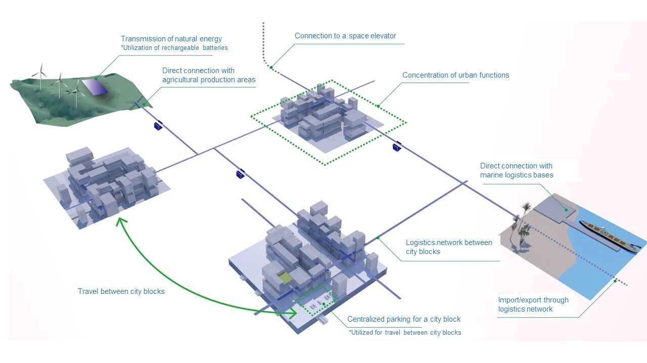 Although there is an idea to move the entire new logistics system underground, an aerial transportation system (ropeway) using carbon nanotube cables will be used to take advantage of the space created by measures such as building reduction.