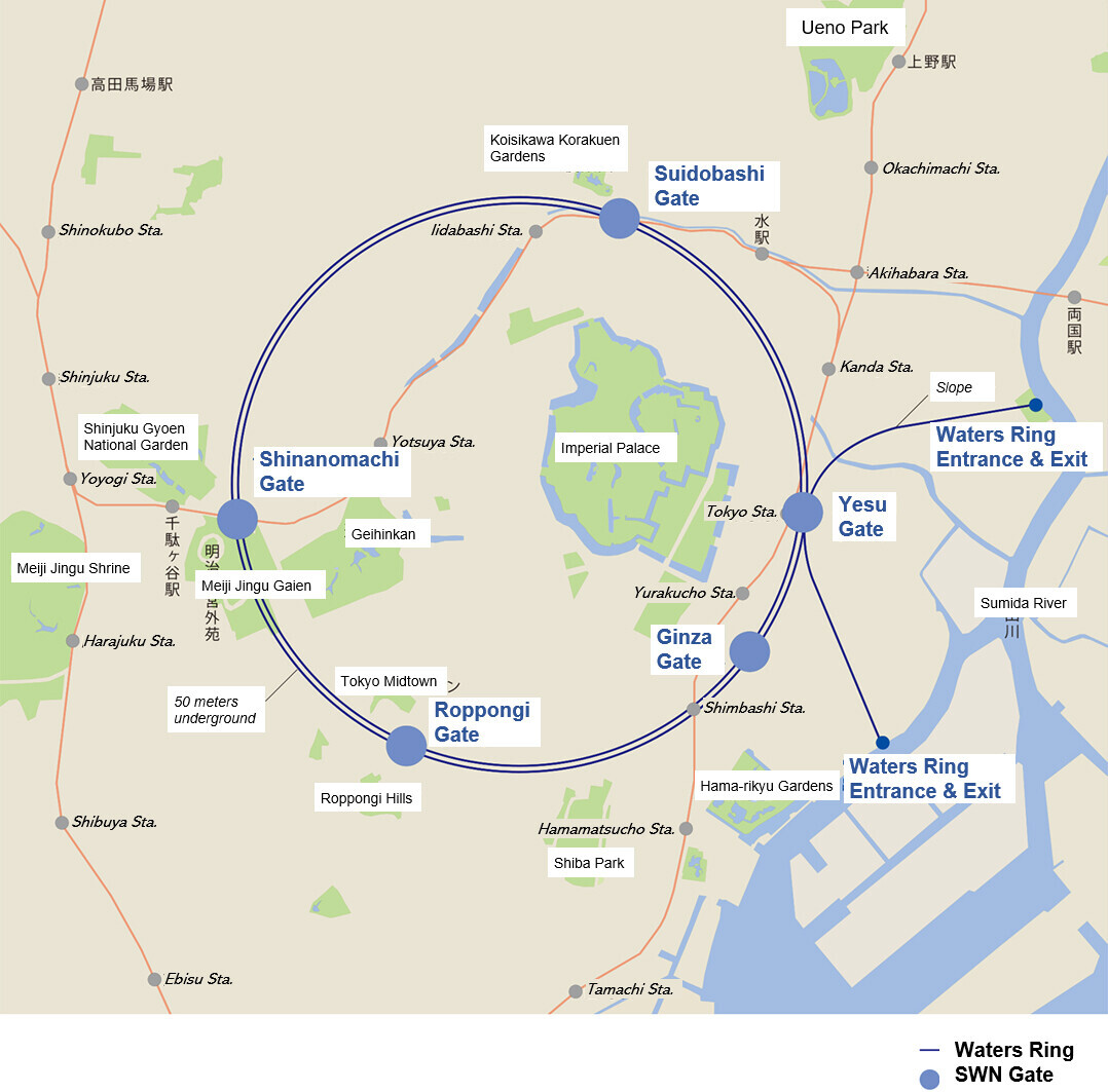 The Waters Ring would be at the heart of the Smart Water Network. A huge, double-ringed water storage facility with a circumference spanning approximately 14 kilometers, the ring would be built 50 meters underground in the center of Tokyo.