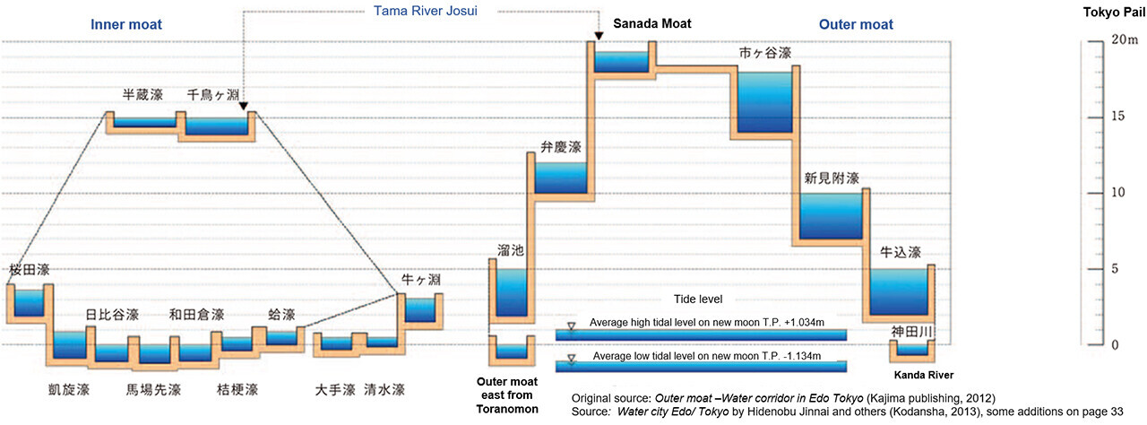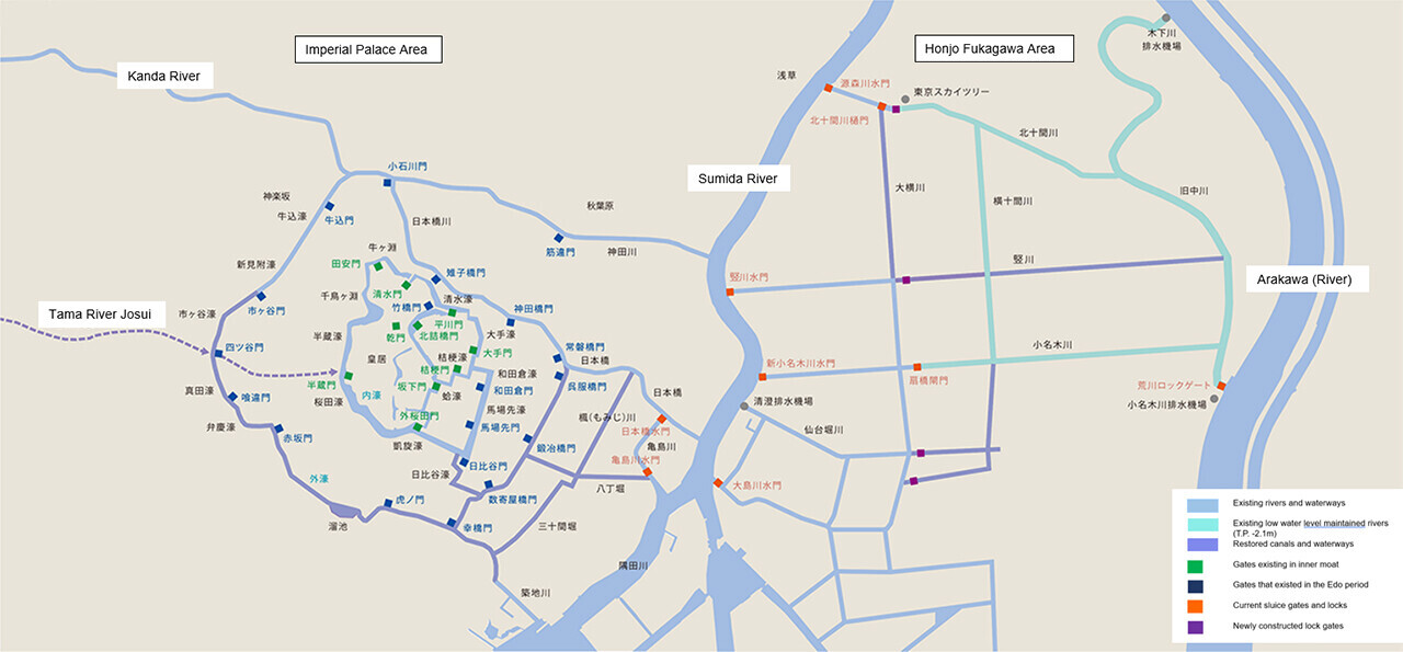 Currently, around 20% of the water for domestic use in the Tokyo city center is supplied through the intake weir on Tama River. Using rainwater as an alternative source for city center general service water would enable a portion of the upstream water intake to be discharged into the Tama River waterway and channeled into the outer and inner moats. If the waterways were to be restored to their former Edo period glory and water flowed into the Sanada Moat at the highest point, the water could then flow naturally down to moats at lower elevations and fill the entire outer and inner moats.