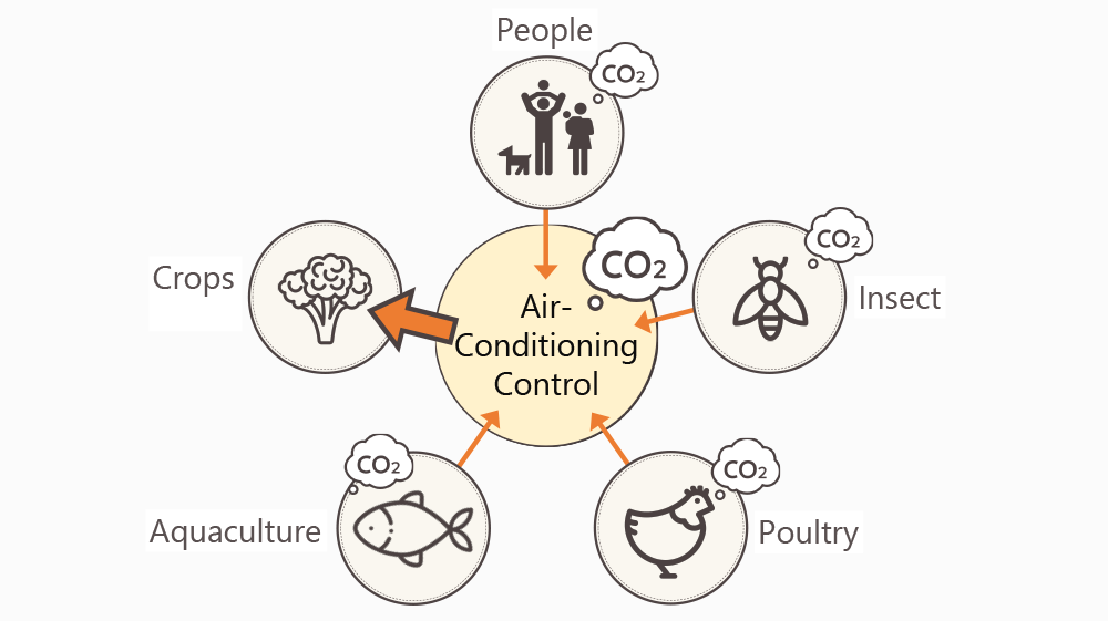 Traditional agriculture produces crops by recycling organic resources: the farmer produces material, people consume it, and emitted material is recovered. The breakdown of this practice is a big factor disrupting the material cycle. Moreover, when farmers add new materials to the cycle, such as imported animal feed, there is more exchange of material beyond the cycle, which makes the problem even more complex.. Compact Agriculture, on the other hand, brings production and consumption closer together and introduces recycling technology so that human activity is separated from the natural world. Even the CO2 that people emit can be used to efficiently grow agricultural products. And by using renewable energy, Compact Agriculture and its system of circulation will run on renewable energy.