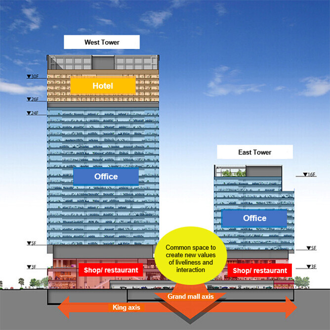 | Outline | S, SRC, CFT construction, B1F, 30F, PH2F, 2 buildings, total floor area 183,132m², number of hotel rooms: 150 |