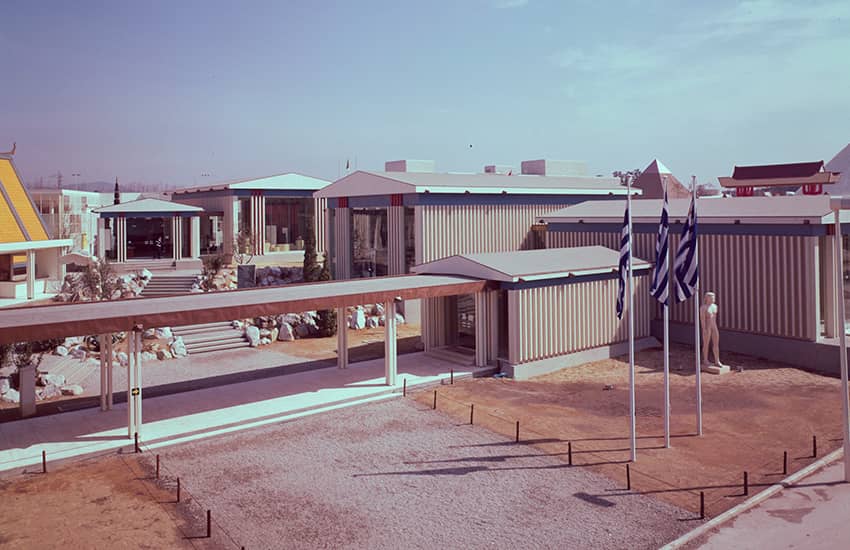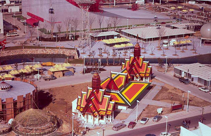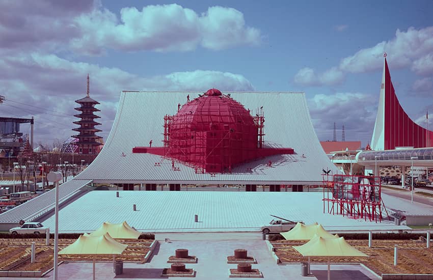 さまざまな取り組みにより、大林組は、土木工事では万国博会場敷地造成B-2工区、第3工区道路改良、お祭り広場の整地、日本庭園の排水などを、建築工事ではお祭り広場(他社と共同施工:JV)とエキスポタワー(JV)を建設。海外パビリオンでは、アメリカ、スカンジナビア、ギリシャ、キューバ、中華民国(台湾)、ハワイ、タイ、アメリカンパーク、サンフランシスコの各館を、国内パビリオンでは、みどり館(全天全周映像アストロラマ)、クボタ館、鉄鋼館(JV)、日本民芸館、ガス・パビリオン、日立グループ館、せんい館(JV)、松下館(JV)など数多くを手がけました。いずれのパビリオンも、独創性と特色を競い合って完成したものです。
