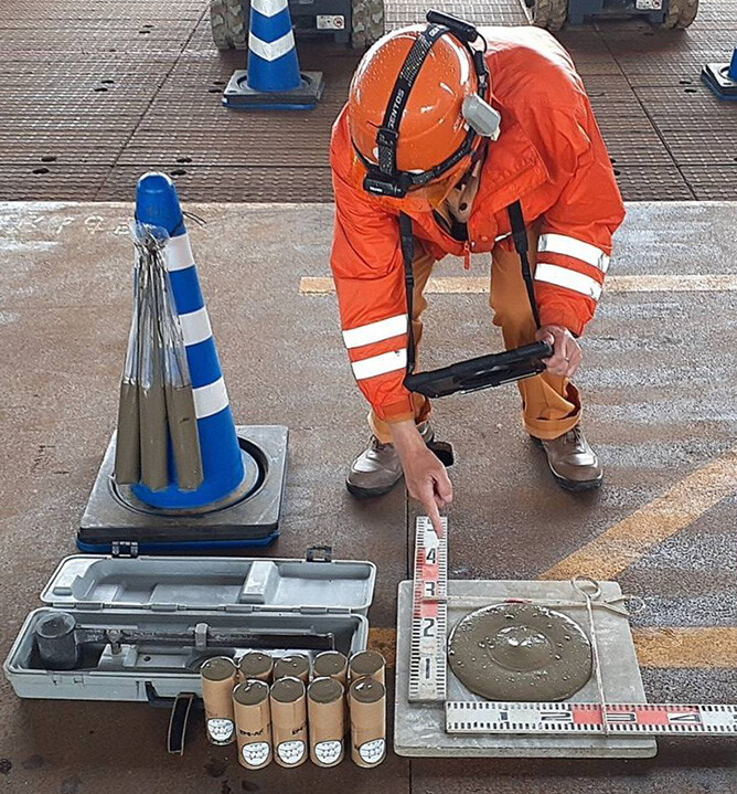 流動化処理土の要求品質は、28日後の一軸圧縮強度が100kN/m²以上、打設時の流動性がシリンダーフロー(※4)で180~300mm、ブリージング率(※5)が1%未満、密度が1.5t/m³以上です。今回開発した、クリーンクリートジオを用いた低炭素型流動化処理土は、いずれの項目も要求品質を達成しました。