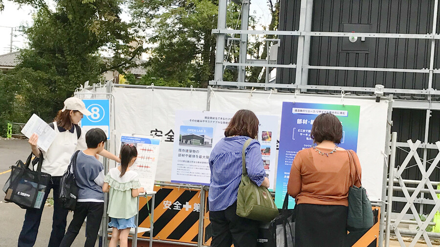 大林組技術研究所(東京都清瀬市)は、1965年の開設以来、技術開発の中核組織として独自性豊かな技術を創出し、実証実験によって確かなものを社会やお客様に提供する役割を担ってまいりました。今年の12月で開設から60年を迎えることを記念して、10月17日、18日に清瀬市民、大林グループの従業員とその家族を対象とした見学会を開催しました。見学会には子どもから大人まで、2日間で計757人が参加しました。 当日は、今年開催された大阪・関西万博の大屋根リングやおさかな牧場、宇宙エレベーターなどの脱炭素社会実現に向けた取り組みや、未来への構想をパネルや模型で紹介しました。また、大林組が開発したさまざまな建設技術について、技術研究所内の各実験施設で担当研究員が説明を行いました。 建材や設備機器をリユースして建設が進む実験棟「オープンラボ3」の紹介パネルを興味深そうに見る参加者 さまざまなシミュレーション技術を用いて技術研究所を一つの「まち」として再現するデジタルツイン(※1)を紹介