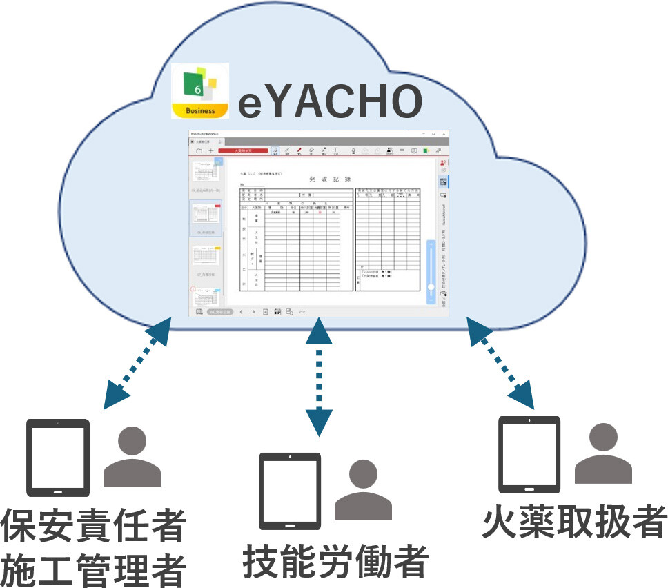 本デジタル帳票は、タブレット端末などでペーパーレス化とクラウドによる情報共有を可能にする施工管理アプリ「eYACHO」を基盤としています。この「eYACHO」上で、19種類の火薬類管理帳票をデジタル化しました。