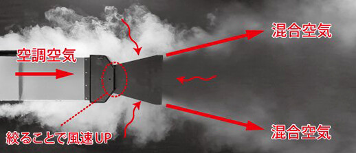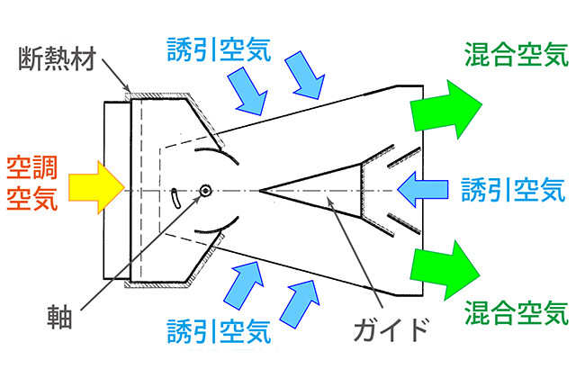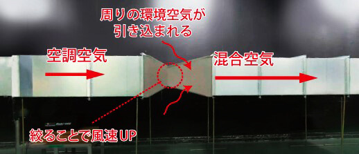 「in-DUCT」は、空調機の空気が同ユニットを通過する際に周囲の空気を誘引する機構を持ち、大風量の混合空気として送風されます。そのため、室温と送風温度との温度差が小さくなり、吹出口の冷却による結露を抑制できます。さらに動力が不要でメンテナンスフリーを実現し、イニシャルコスト、ランニングコストの削減を可能にしています。