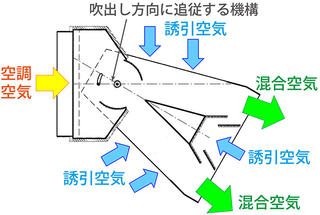 「in-DUCT」吹出口タイプは、誘引を生み出す「くぼみ」の前後の縮小部と拡大部を分割し、拡大部の回転が可能な機構を採用しています。これにより、誘引性能を確保しながら、最大30度まで吹出し方向を調整可能で、空調対象エリアに気流を向けることが可能です。また、吹出し部に風向調整オプションを設置することで、上下方向だけではなく左右方向にも風向を調整できます。
