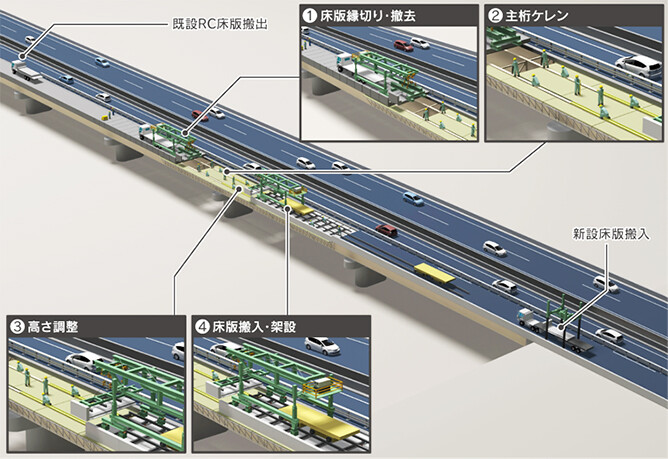 道路橋の床版更新は、道路の供用を維持したまま行われることが多いため、交通規制の期間を短くする「床版取り替え期間の短縮」や、交通規制の影響範囲を最小限に抑える「安全施工」の技術が求められます。