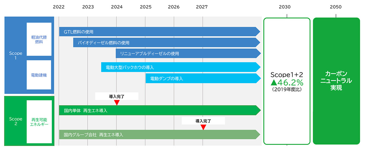 大林グループは、パリ協定に整合した温室効果ガス排出削減目標(2030年度目標)を設定し、2019年度比で2030年度に46.2%削減し、2050年度カーボンニュートラルを実現することを目指しています。その達成には、再生可能エネルギー電力の導入に加え、建設機械で使用される軽油由来のCO2排出削減が不可欠です。建設工事におけるCO2排出量の多くは、建設現場で使用される建設機械の燃焼由来であり、軽油代替燃料の利用は、直接排出(Scope1)量削減に直結する重要な取り組みと位置付けています。
