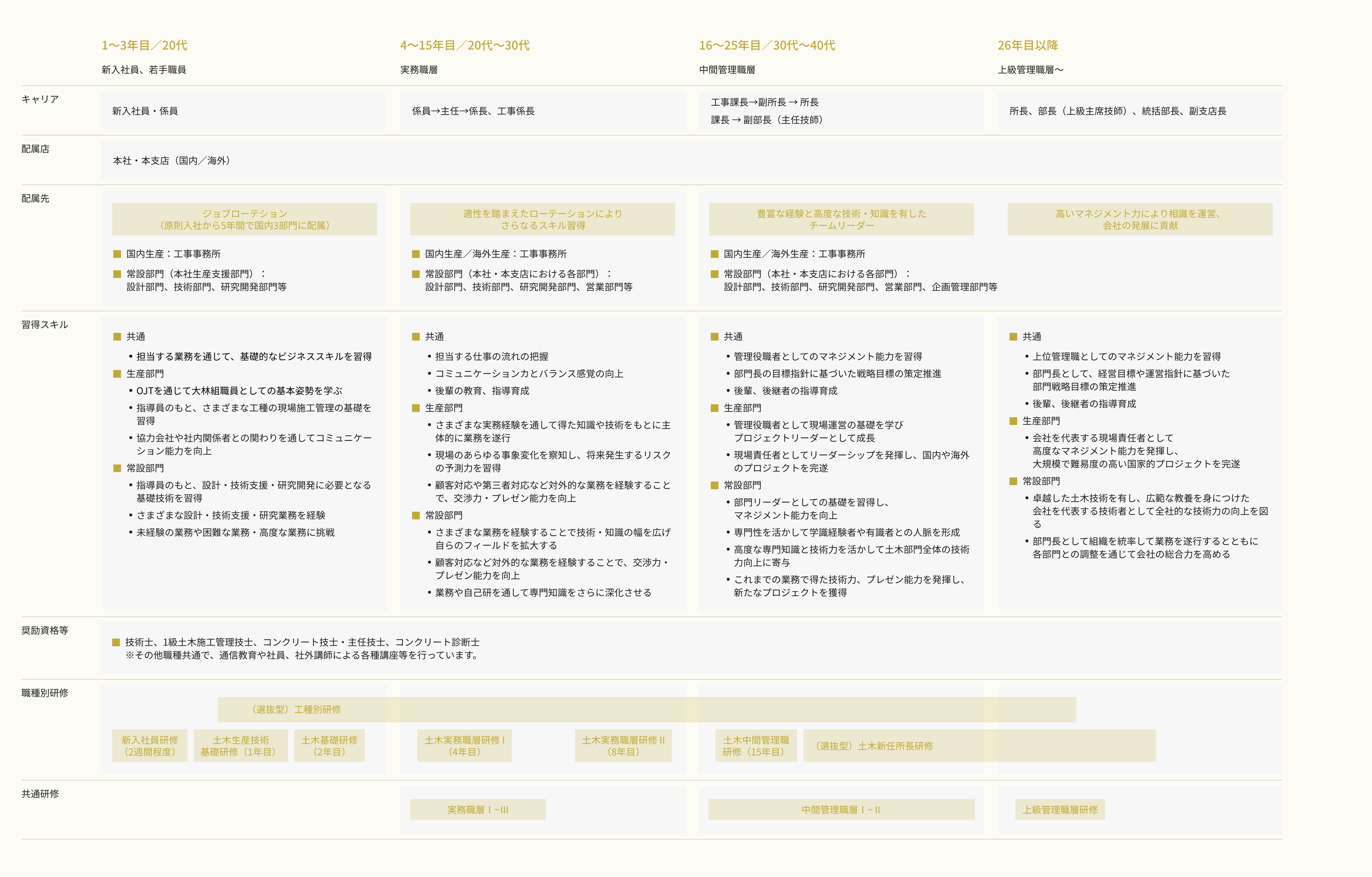 地域ごとの諸条件に応じた現地一品の土木構造物をつくりあげる施工管理、設計や技術開発などを通じて現場を支える常設部門。