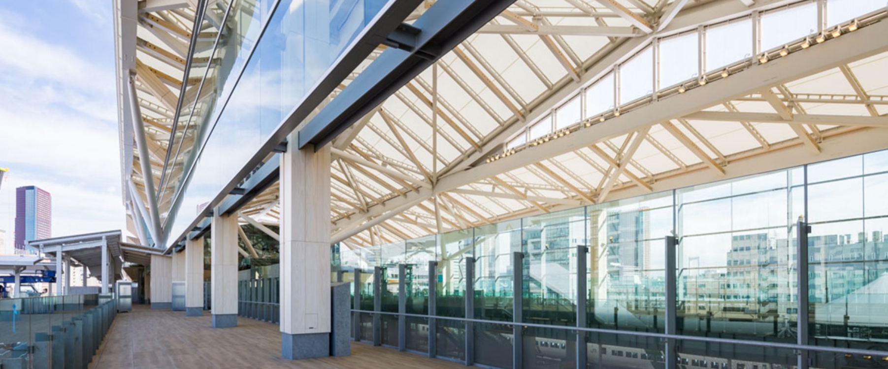 駅は交通の要であると同時に街のランドマークである。完成した「高輪ゲートウェイ」駅は大きな注目を浴び、特にその外観は柔らかな膜構造の大屋根が話題となった。「折り紙」をモチーフとしたデザインは日本ならではの"優しさ""もてなし"を感じさせるとして、まさに国際都市をめざす街のアイコンにふさわしいと歓迎されたのである。外装にはふんだんにガラスを使用。光が射し込む1000㎡の吹き抜けは、これまでの駅のイメージを一新するほどの斬新さだ。著名建築家によるこうしたデザインをかたちにしていくうえで立ちはだかったのが、山手線、京浜東北線、東海道線に囲まれた中での施工の安全性確保という難題だった。