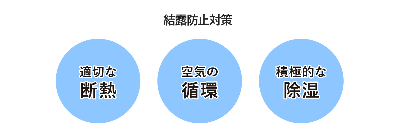 結露を防止する対策には、適切な断熱の実施、ファンによる空気の循環、換気による積極的な除湿が有効です。産業用除湿器を導入すると、より確実な除湿が可能です。