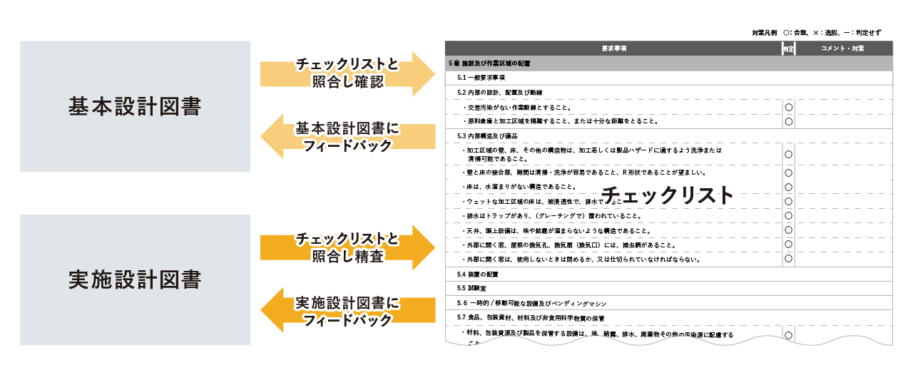 HACCP(※1)、FSSC22000(※2)、JFS規格(※3)、AIB(※4)について、大林組独自のチェックリストを用意しています。基本設計時と実施設計時に、対象とする食品衛生規格に適合しているかをチェックリストで確認し、必要に応じてお客様とともに脆弱(ぜいじゃく)事項について、ハード、ソフトでの対応策を検討します。