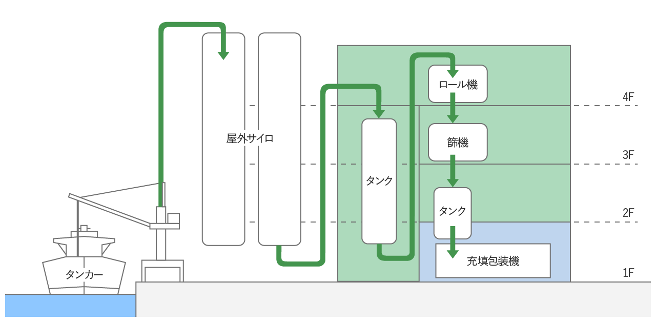 屋外に設置される大型のタンクやサイロなどは、タンカーやローリー車などからの供給方法、タンク/サイロ周りのユーティリティ計画、および搬入据付方法を考慮して、計画の初期段階から配置を検討します。タンク/サイロの計画と建築の計画を同時に行うことにより、効率の高い製造施設を実現します。