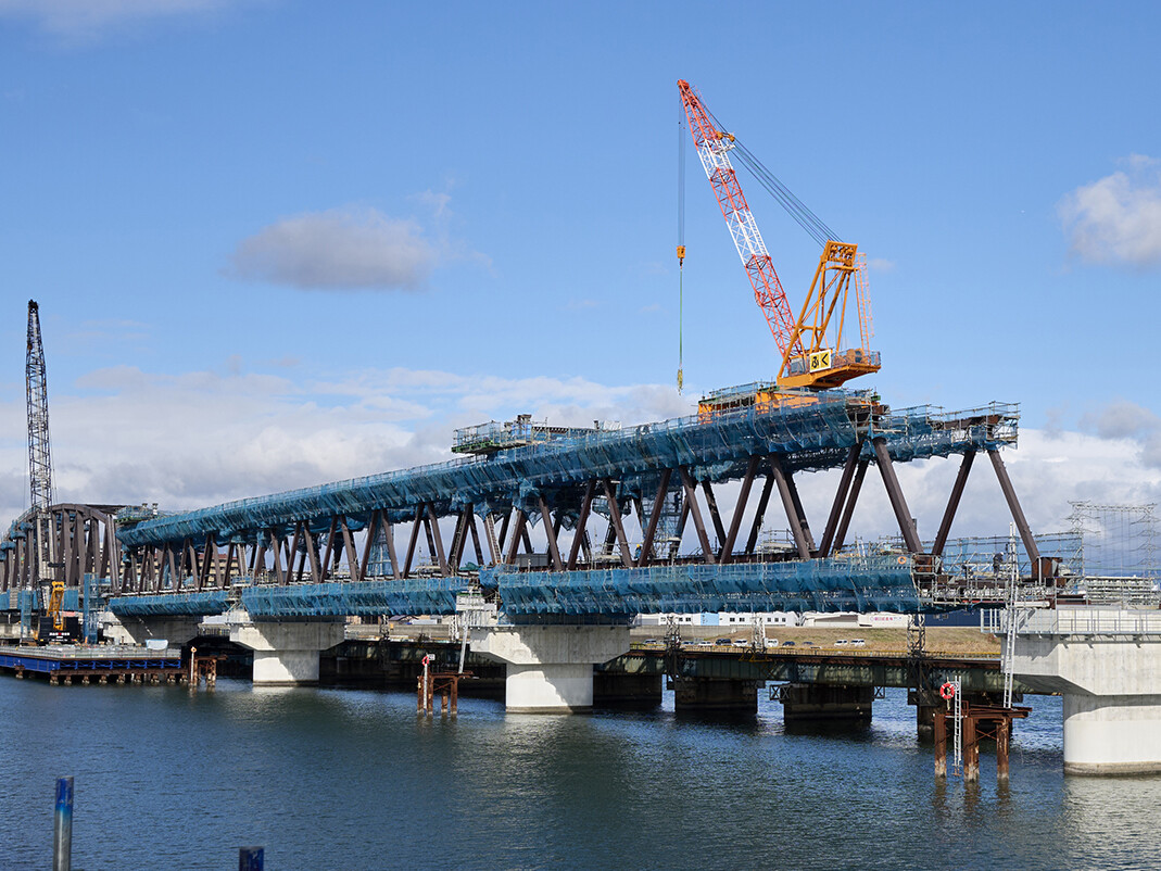 橋桁を架ける上部工の施工は、2つの工法により進めている。陸上から岸に近い曲線形のトラスは「トラッククレーンベント工法」を、河川内のトラスは「トラベラクレーン工法」を採用している。