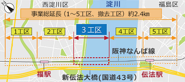 事業全体の総延長は約2.4kmに及び、5工区に分かれて工事が進められる。大林組は、福駅側の右岸から淀川の中央部分までの約400m区間となる第3工区を担当している。