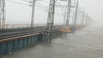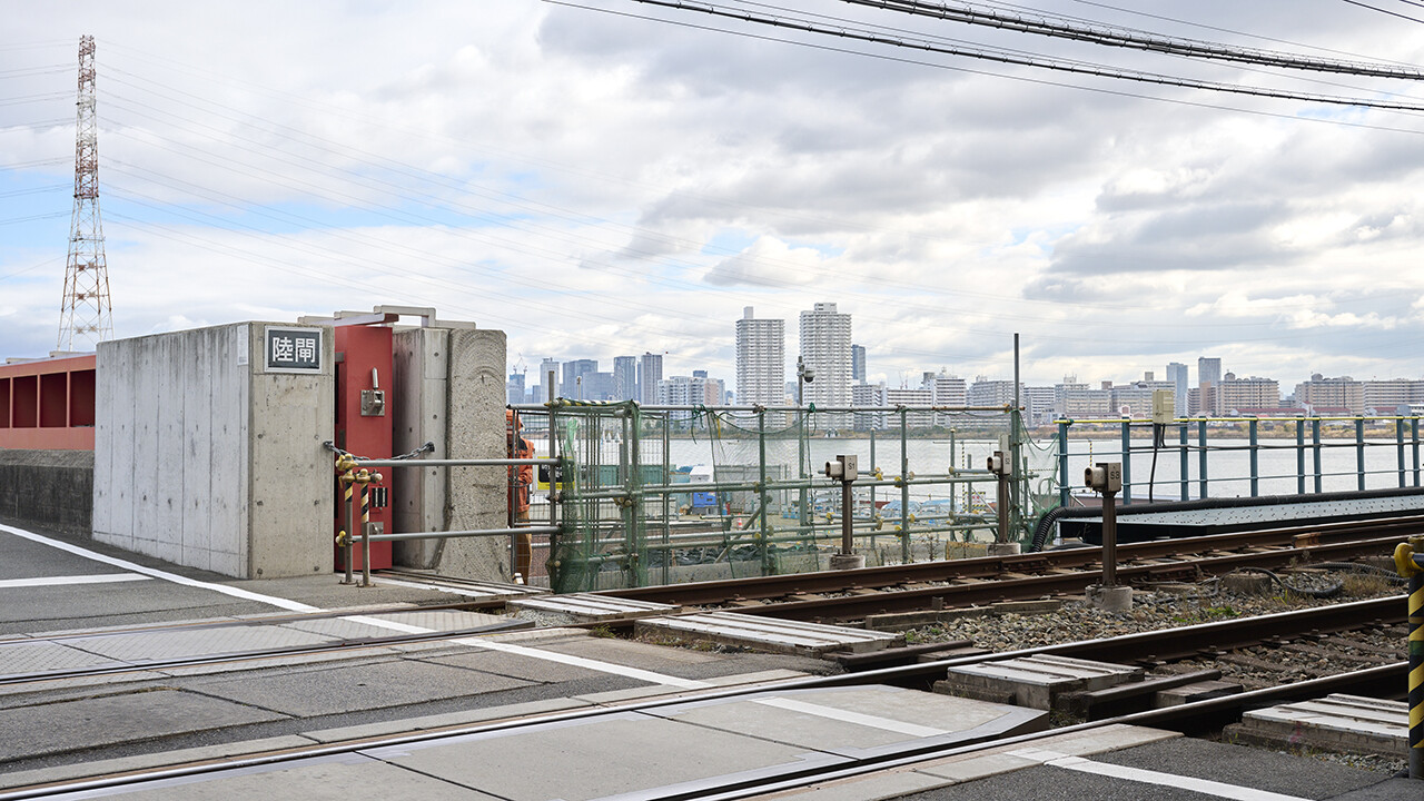 高潮の際には列車の運行を止め、陸閘で線路をふさいで堤防機能を維持(手前が堤防、奥が線路)