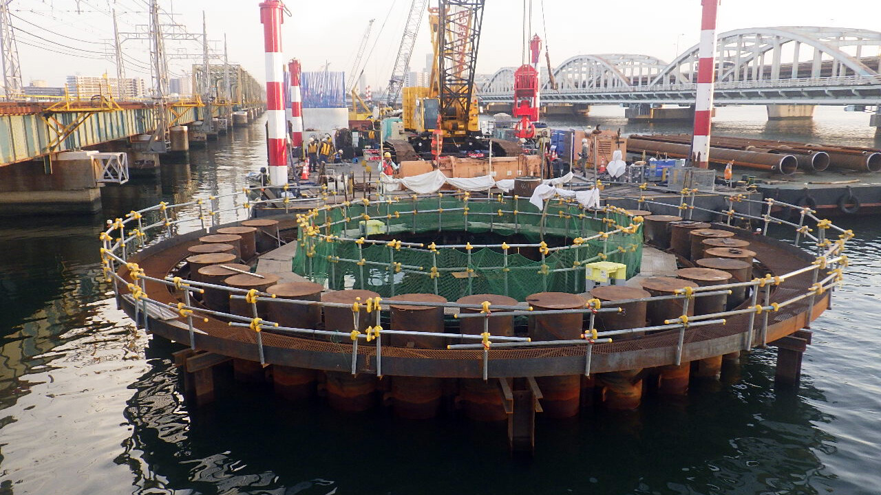 堤防を挟んで河川の内外2基の橋脚は、気圧の力で地下水の浸入を防ぎながら地中を掘削するニューマチックケーソン工法で基礎を構築する。既存の橋脚と新設する2基は非常に近い位置にあり、現在の淀川橋梁の基礎に影響を与えないよう細心の注意を払いながら、地下45mまで掘削しなければならない。施工時の振動や施工スペースを抑えられるニューマチックケーソン工法が適している。