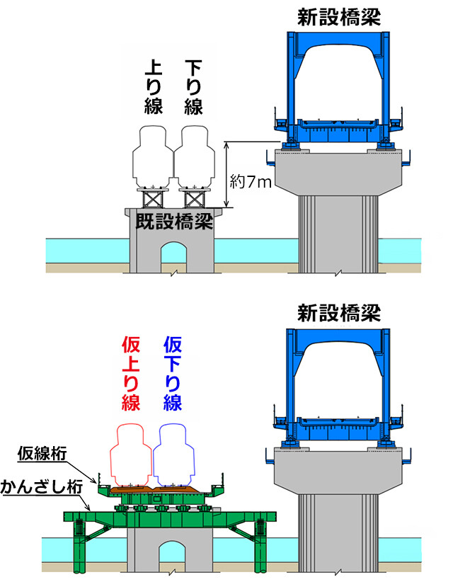 営業線の線形を変えるため仮線桁を支える「かんざし桁」(緑色)を設置。仮線は既設橋梁の中心から左側(上流側)にずらした
