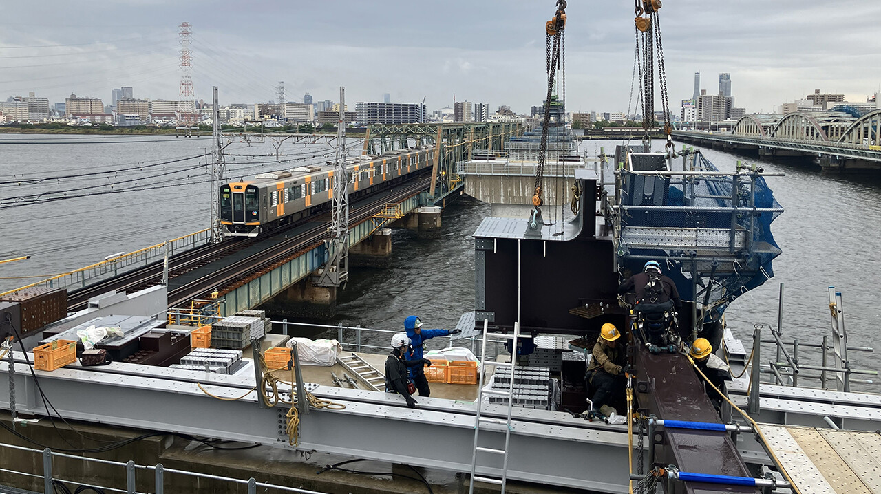 阪神なんば線・福駅と伝法(でんぽう)駅間に架かる淀川橋梁は、堤防よりも低い位置に設置されていることから、防災上の深刻な課題の一つになっている。大林組は、地域の防災力を強化し、鉄道の安全な運行を守る橋梁架け替えの工事を行っている。
