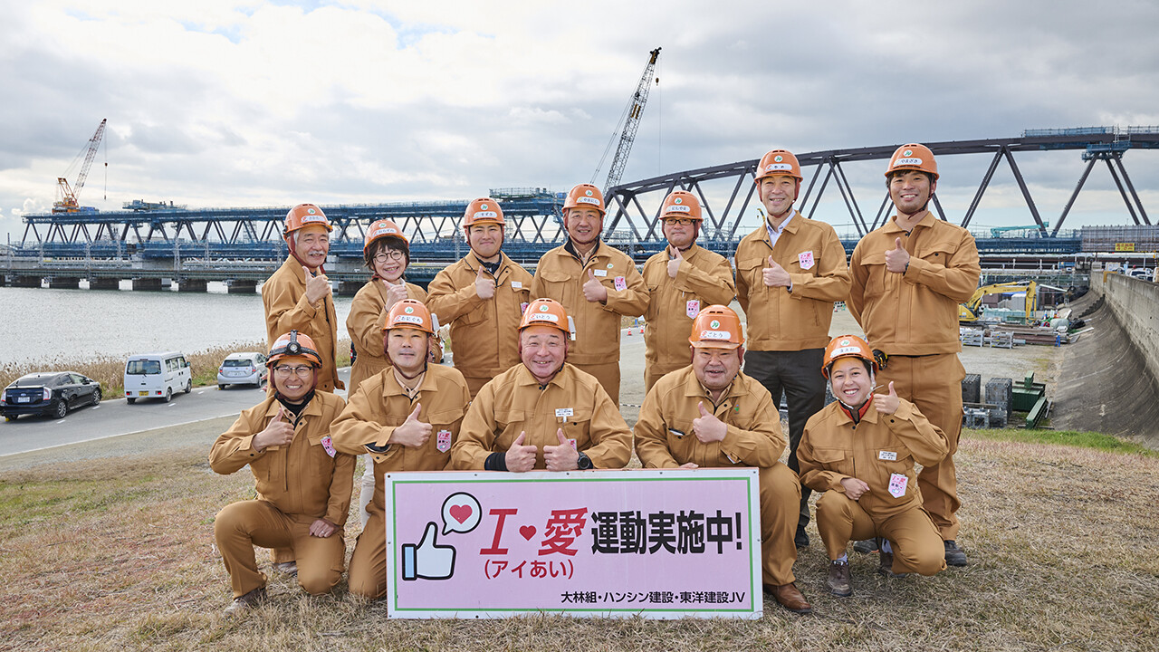 この現場でアイデアを出し合って生まれた独自の取り組みが多くある。代表例が「I・愛運動」だ。トラックの荷台を覆うシートに子どもが書いたメッセージなどを掲げることで事故が減ったという運送会社の事例に着想を得て、大林組と協力会社の職員とで知恵を出し合いながらアレンジした。現場で独自のワッペンを作り、その裏に各自の愛する人や愛する物を書く。朝礼時、それらに15秒間思いをはせ、今日一日無事に作業を終えて家に帰ることを誓うというものだ。「この取り組みの導入以降、現場運営がさらに円滑に進むようになりましたし、安全への取り組みに対する自分ごと化が進んだように感じています」と伊藤。
