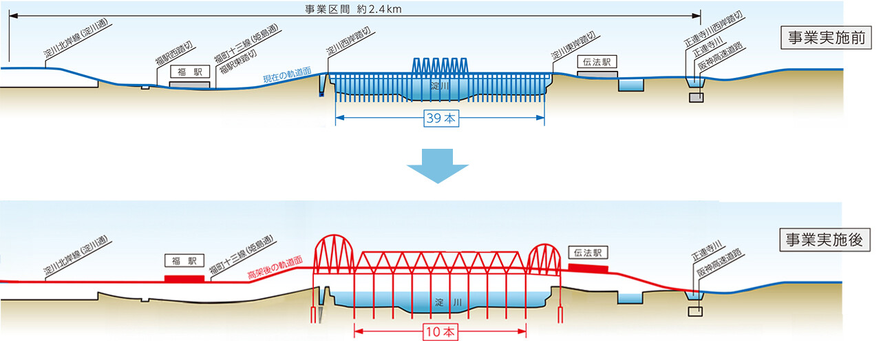 2018年、国と自治体、阪神電鉄が共同で「阪神なんば線淀川橋梁改築事業」をスタートした。現状より7m高架化し、橋脚を39本から10本へ削減する計画で、河川内の構造物が水流に与える影響を示す指標「河積阻害率」は大幅に改善される。