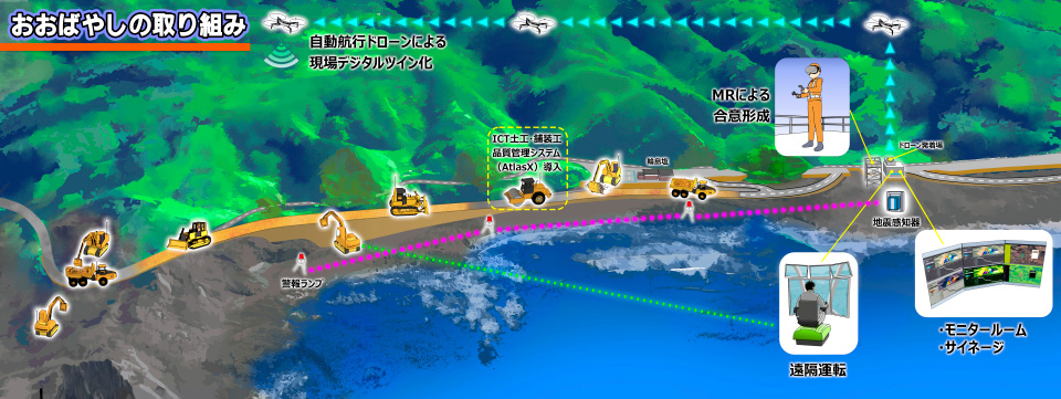 大林組は、山岳トンネルの施工を自動化・遠隔化する統合システムを開発し、さまざまなトンネル工事現場で適用しています。今後、全ての現場での適用を目指し、開発を加速させています。