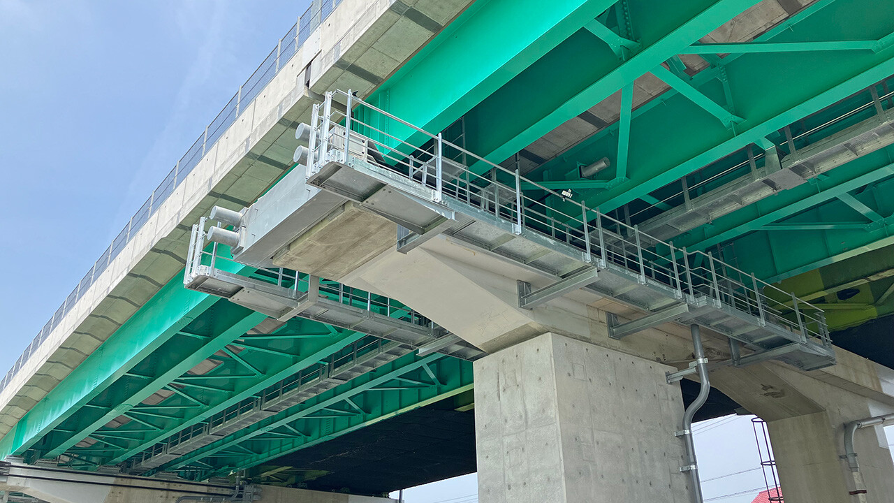 HIGASHI-MEIHAN EXPWY Yatomi Viaduct (Out-bound)東名阪自動車道の弥富高架橋(下り線)の内、約1.6kmの床板取り替えを幅員方向分割施工で行いました。移動式床板架設機のハイウェイストライダー®や、側道から資機材が搬出入できる揚重設備を採用して急速施工を実現し、工事による通行への影響を最小化しました。