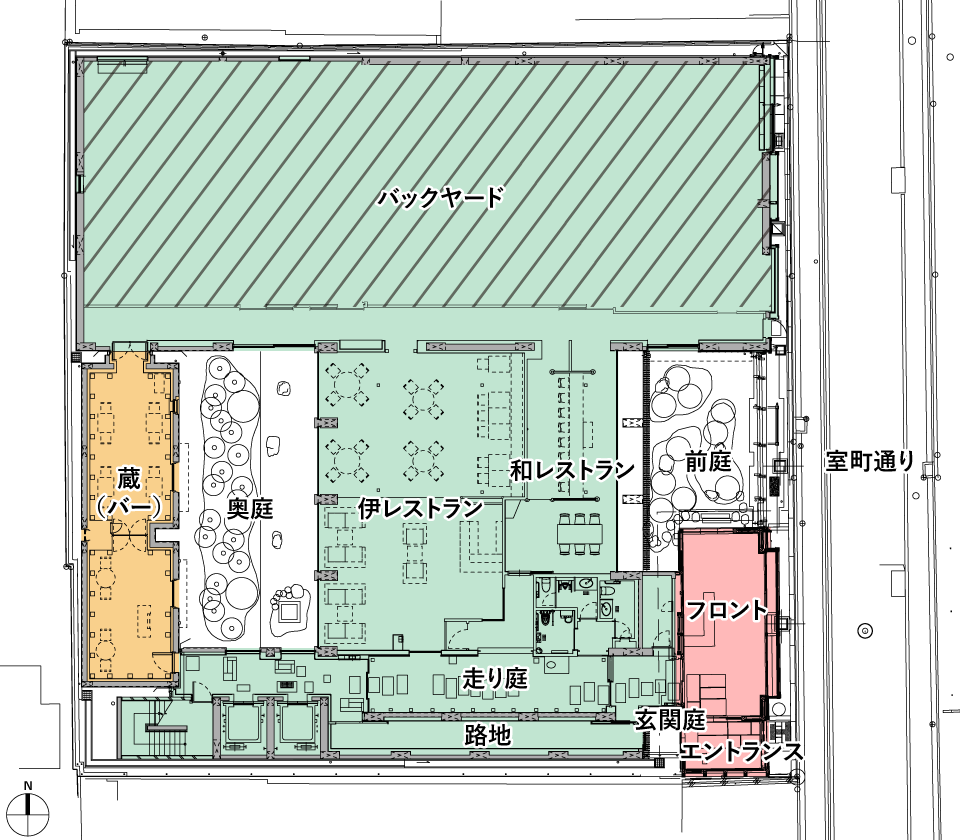 室町通りに面する表屋と高塀は構造補強して現況を保存し、その他の部分はそれに倣う形でファサードを構成し、間口約33mの町家のたたずまいをつくり出しました。