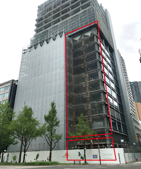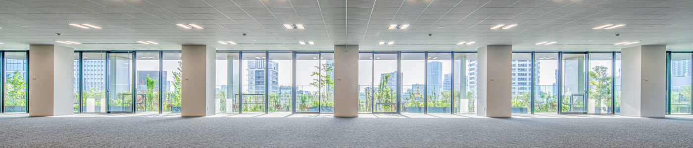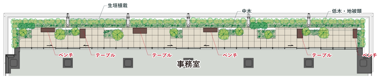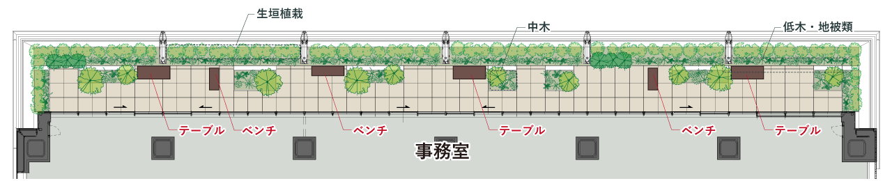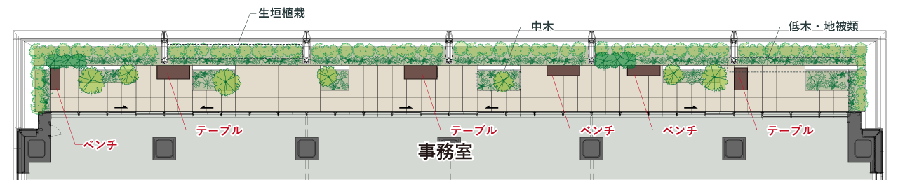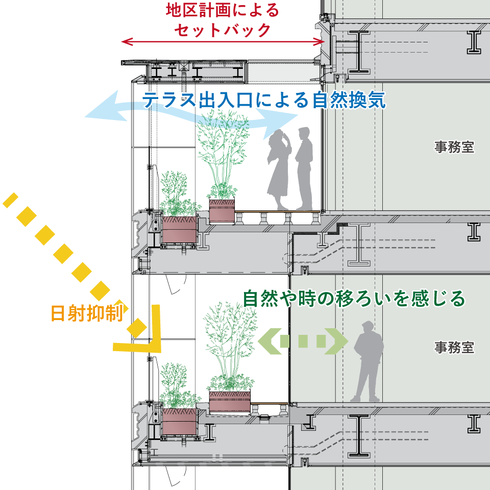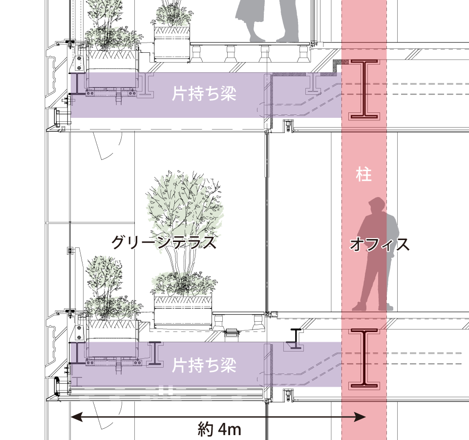 窓際から2mの範囲には鉄筋コンクリートの床を設け、人が自由に出入りできるスペースに。先端には床をつくらず植栽だけを配して装飾部として扱うことで、グリーンテラス全体を容積率不算入(建物の延べ床面積に算入しない)とし、オフィスの面積を最大限確保しました。