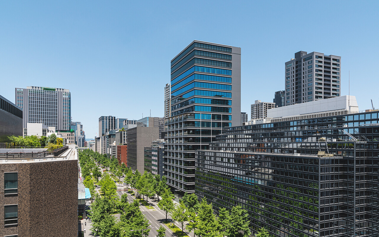本町ガーデンシティテラスは、大阪市の都心部を南北に走るメインストリート・御堂筋に面する、地下2階、地上19階建てのテナントオフィスビルです。低層部に広がる緑豊かな「グリーンテラス」は街並みに新たな潤いを重ね、地下に設けたサンクンガーデン(周囲より一段低くなった広場や庭園)は大阪メトロ御堂筋線・本町駅とつながり、緑や光を地下へと導きます。